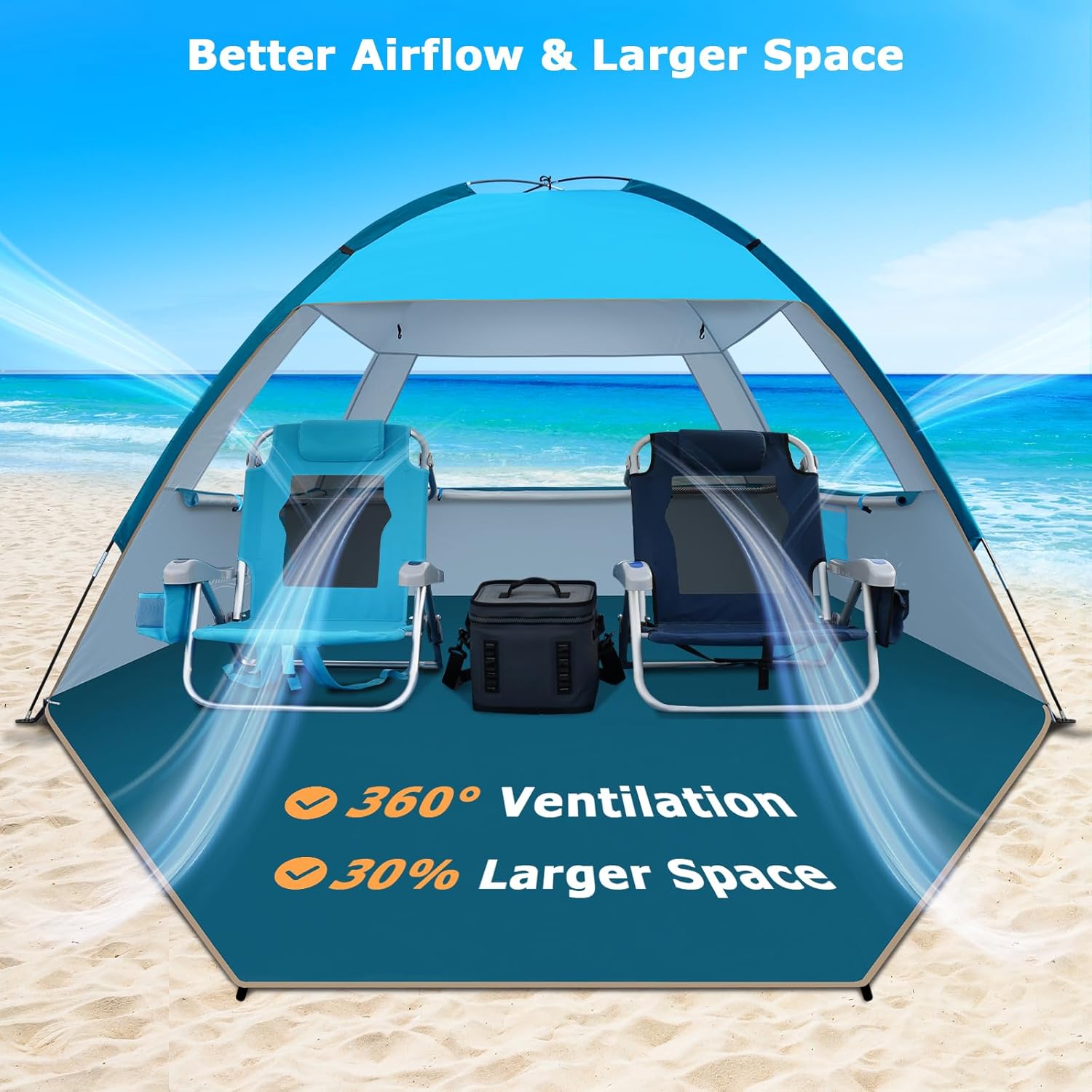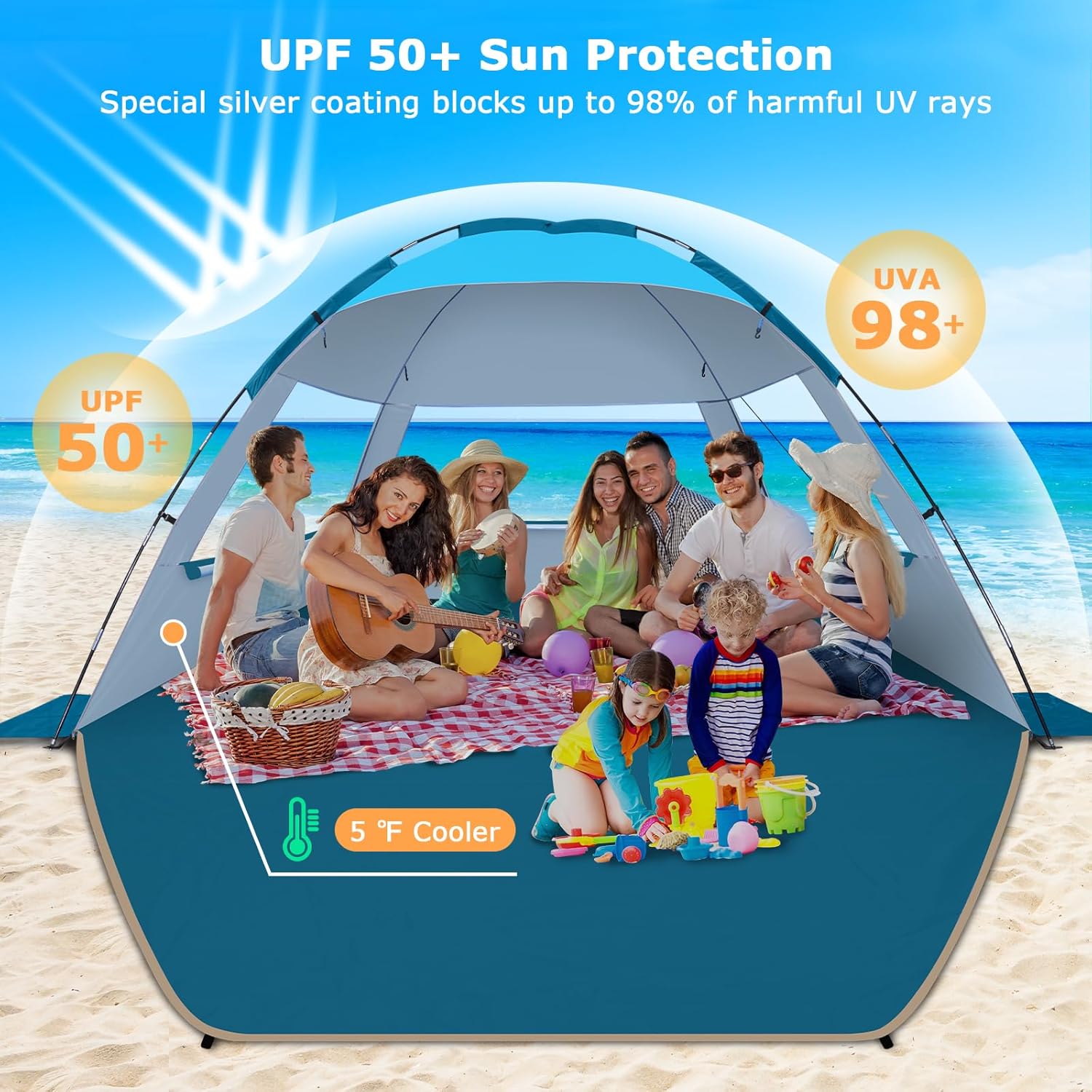 - UPF 50+ und 360° Belüftung: Das Outdoor-Zelt besteht aus 210D Oxford-Gewebe und strapazierfähigem 190T Polyester mit einem speziellen silberbeschichteten Stoff, der Sonnenstrahlen reflektiert und absorbiert. Unsere Strandzelte blockieren effektiv bis zu 98% der schädlichen UV-Strahlen, halten Sie und Ihre Familie sicher vor starker Sonne und senken die Temperatur im Zelt. Die 4-seitige belüftete Struktur mit 3 großen Fenstern und D-förmigen Netztüren bietet eine hervorragende Belüftung und Frische für Sie