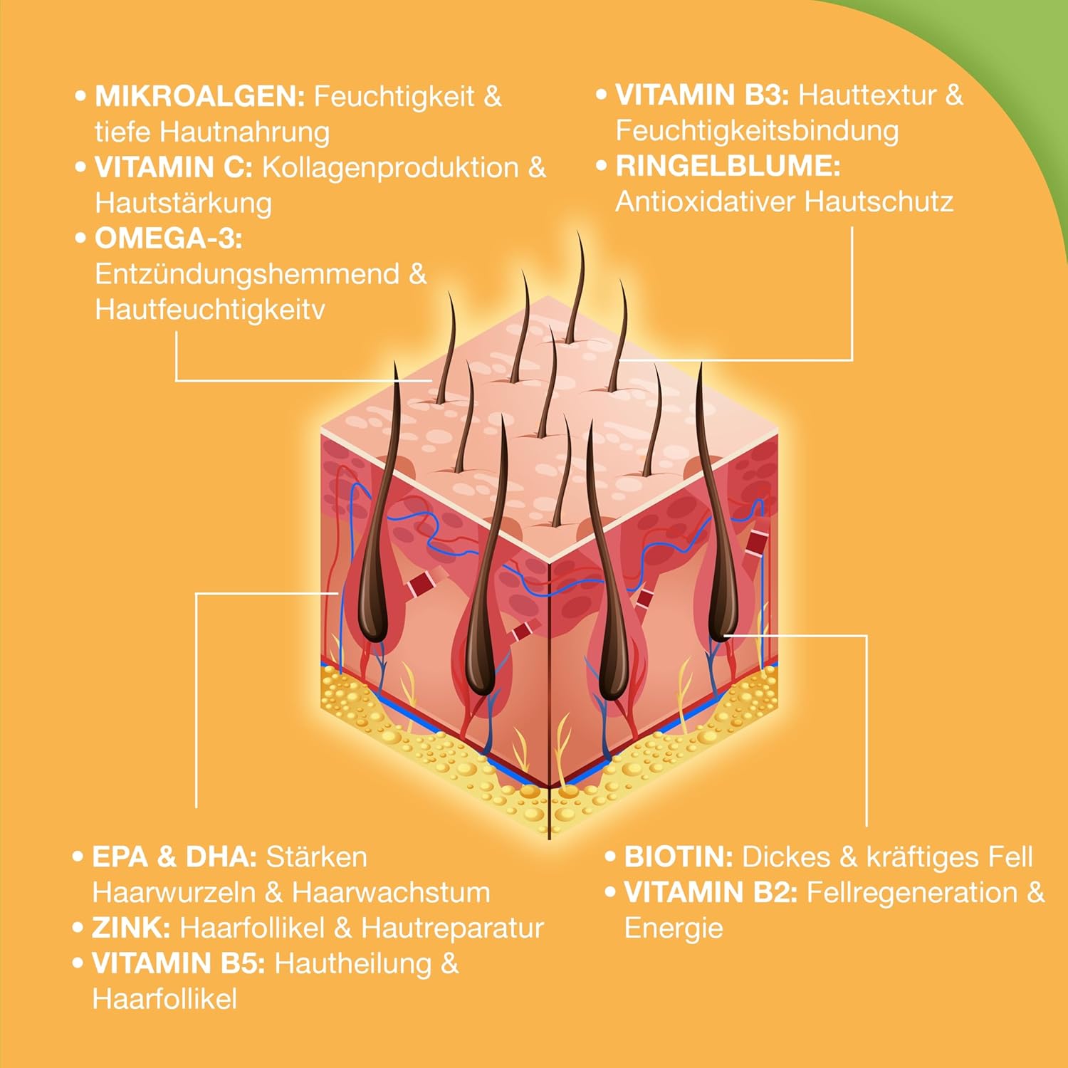 - ๐๐ฅ๐๐๐ง๐ฉ๐ข๐๐๐ ๐ช๐๐ฅ๐๐ฆ๐ง๐ข๐๐๐ ๐ร๐ฅ ๐๐๐ฆ๐จ๐ก๐๐ ๐๐๐จ๐ง ๐จ๐ก๐ ๐๐๐๐: Die Kombination aus Lachsรถl, Bierhefe, DHA aus Mikroalgen, Biotin, Zink, Kollagen und Ringelblume regeneriert die Haut, stรคrkt das Fell und beugt Problemen wie Juckreiz oder Haarausfall vor โ fรผr langfristige Fellgesundheit.