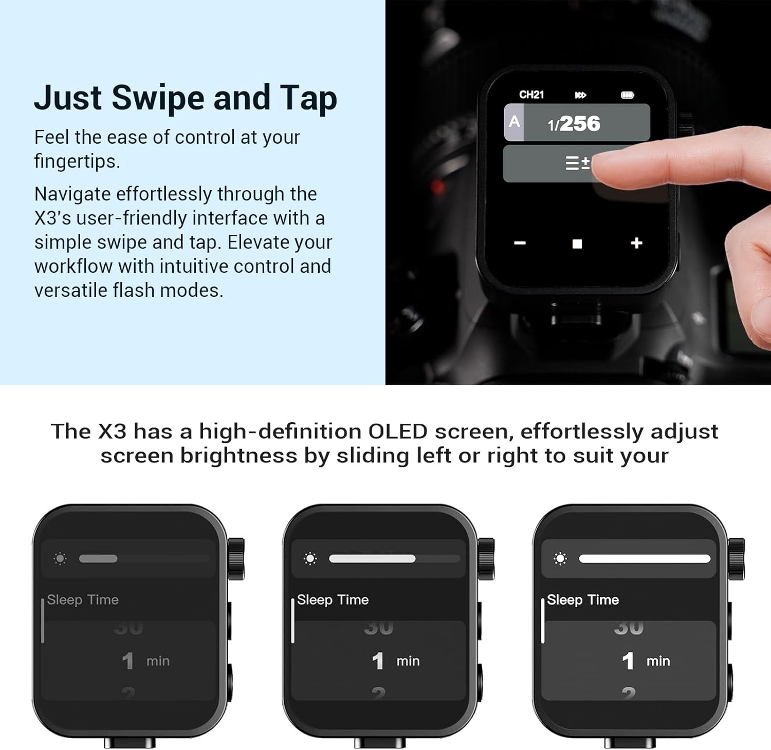 - [Schermo touchscreen OLED] Con il touchscreen OLED ad alta definizione, GODOX X3 offre un display ad alto contrasto e una frequenza di aggiornamento rapida per un'esperienza migliore. Facile regolazione della luminosità dello schermo in pieno sole o in condizioni di scarsa illuminazione, perfetta per scatti interni ed esterni. (C'è anche un blocco dello schermo per evitare tocchi involontari. Per gli scatti freddi con i guanti, regola facilmente i parametri tramite i pulsanti sul lato.)