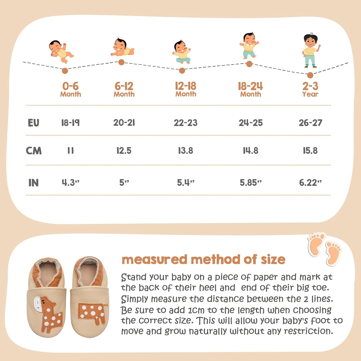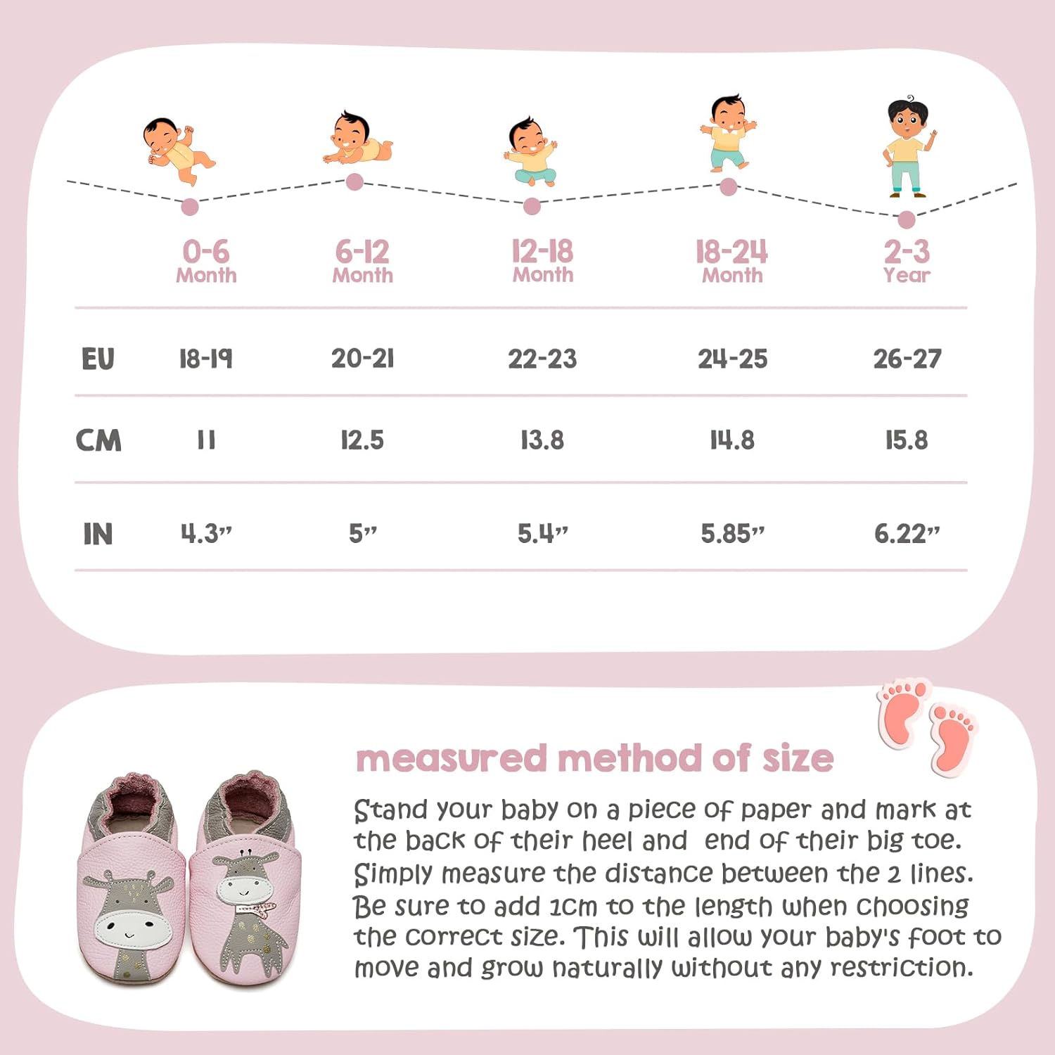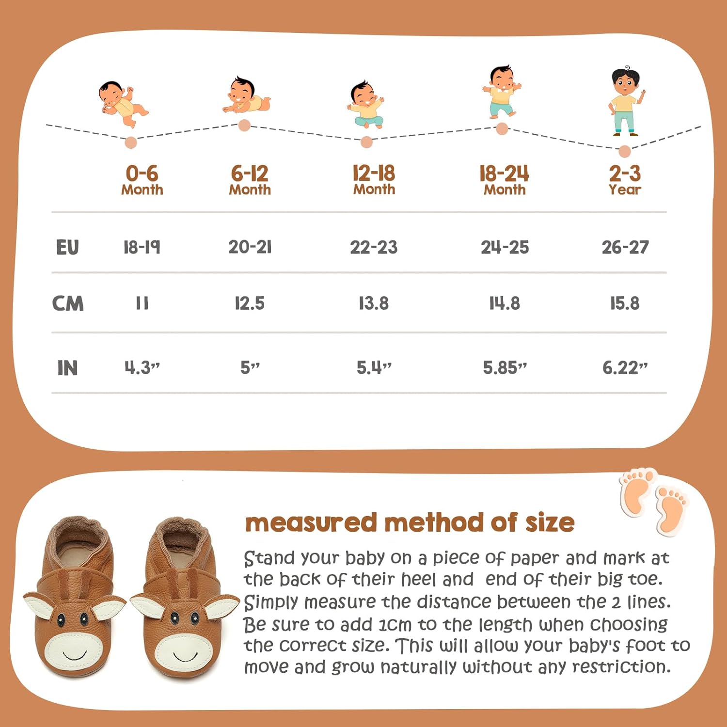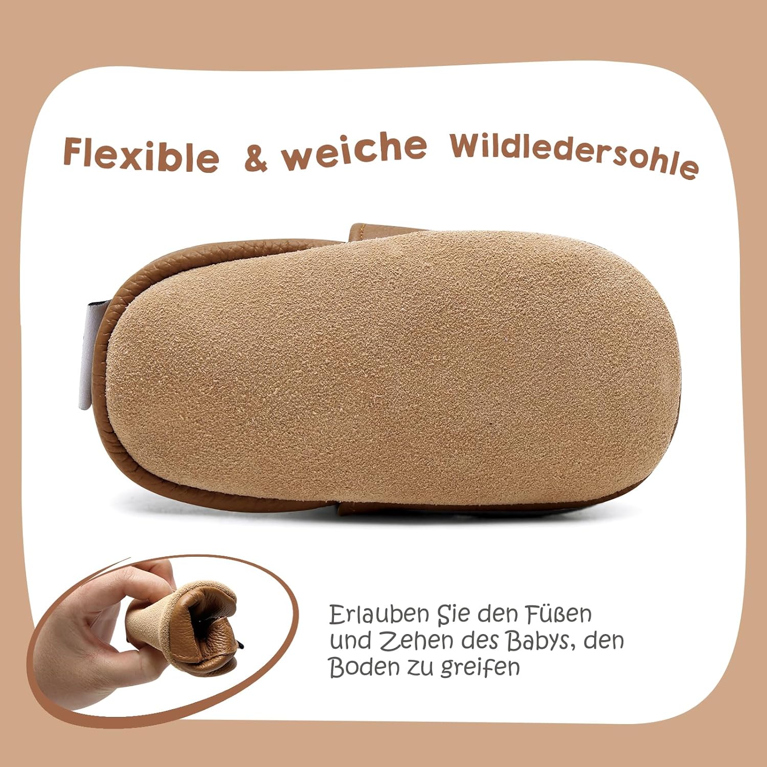 - Die Sohle der Baby Lauflernschuhe besteht aus weichem Wildleder, das leicht und flexibel ist, so dass die Füße des Babys besser passen und die Berührung des Bodens fühlen und dem Baby ein "barfuß-Gehen"Erlebnis gebe