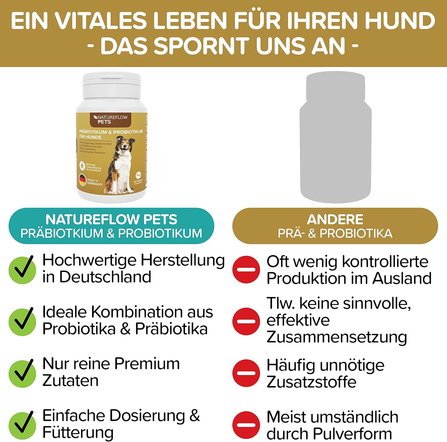 - ✅ IDEAL FÜR DIE STÄRKUNG & BALANCE DER DARMFLORA: Durchfälle, Antibiotika- & Wurmbehandlungen oder auch einfach Stress oder Futterumstellungen können das empfindliche Gleichgewicht der Darmflora Ihres Hundes nachhaltig stören. Mit den Natureflow Probiotikum Tabletten erhält Ihr Hund einerseits ein Probiotikum, das die schädlichen Darmbakterien verdrängt, andererseits verschiedene Präbiotika, die den verschiedensten „guten“ Darmbakterien als Nahrung dienen und damit deren Wachstum anregen