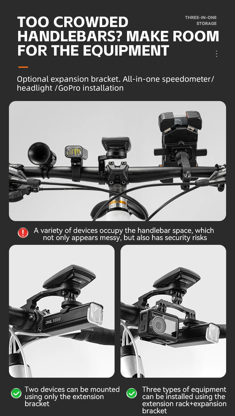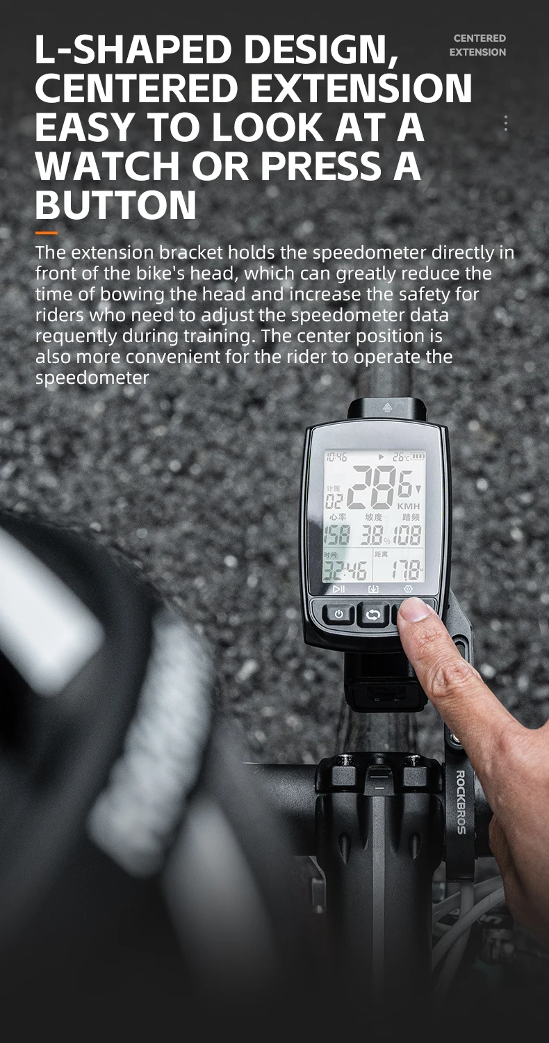 O suporte de extensão mantém o velocímetro diretamente na frente da cabeça da bicicleta, o que pode reduzir bastante o tempo de inclinação da cabeça e aumentar a segurança dos pilotos que precisam ajustar os dados do velocímetro necessários durante o treinamento.A posição central também é mais conveniente para o piloto operar o velocímetro.